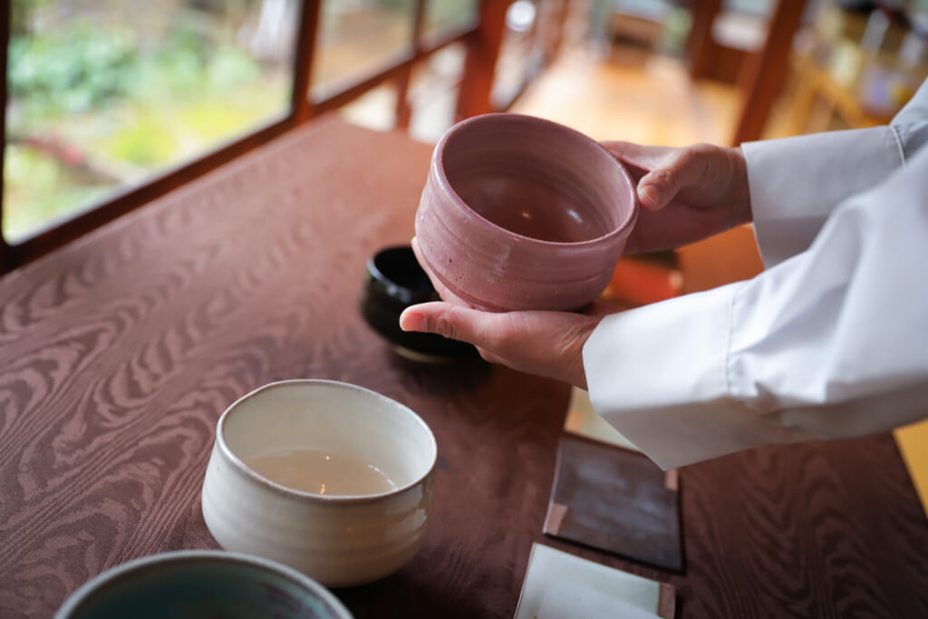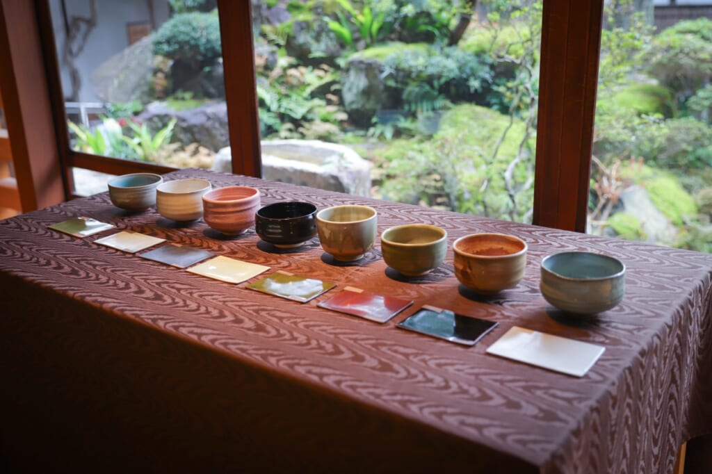 ご試食の際には、伊賀焼の器をご用意しています。お客様ご自身でお好みの茶碗とお皿をお選びください。伊賀焼は奈良時代に始まり、茶の湯文化が花開いた桃山時代には、あえて歪みや変化を生かした個性的な造形が多数誕生。その侘び寂びを体現する佇まいは、千利休をはじめとする多くの茶人に深く愛されてきました。
